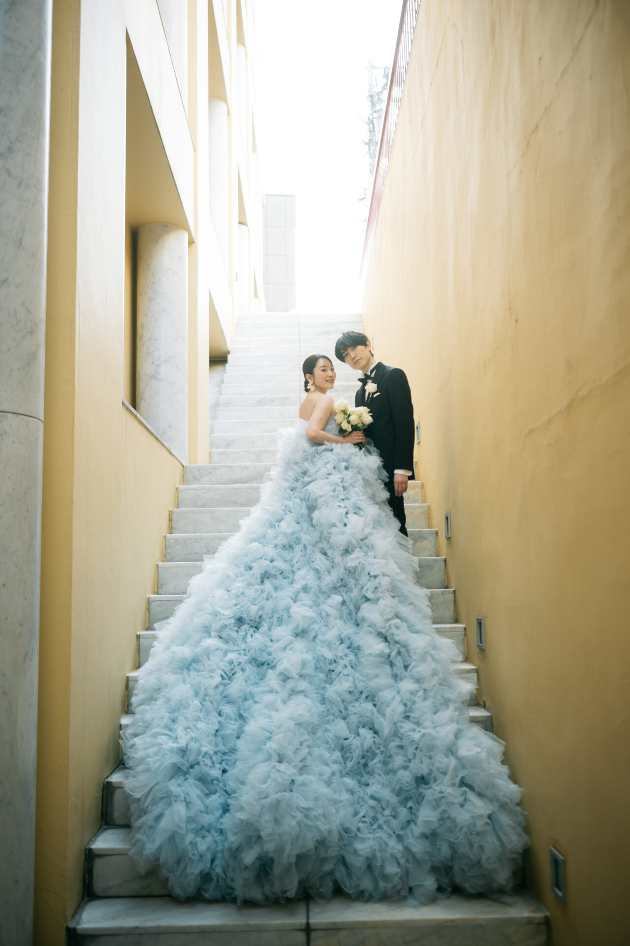 Dresses Studio AOYAMAの撮影シーンとも相性が良く、光の陰影を活かしたショットでは、ドレス本来の造形の美しさが際立ちます。