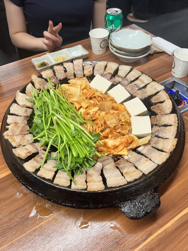 明洞ではプレッツェルやサムギョプサルを食べ、お腹いっぱいになりました。(日本より1人前の量が多くびっくりでした!)