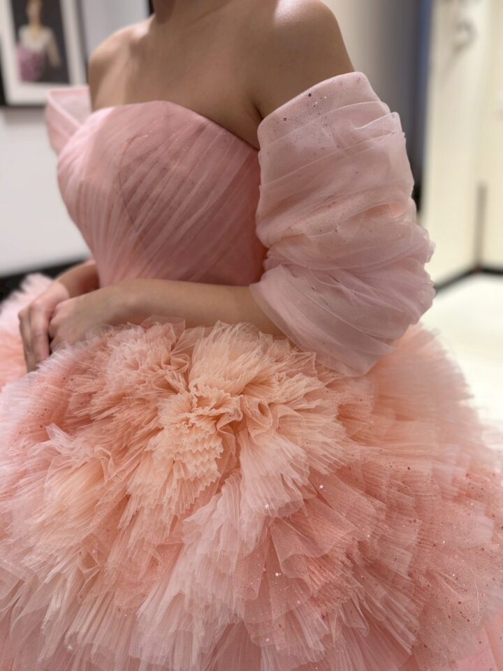 最近アソシエイトのスタッフなど新しく入ってもらったスタッフが増えたのですが、繁忙期でなかなかゆっくり教える暇もない中、先日新作ドレスを着てもらいました。