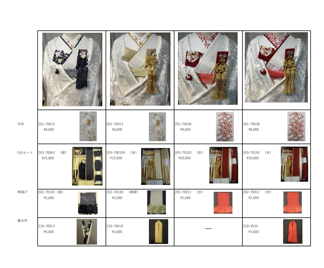 お小物のお写真をお見せするだけではイメージがつかないと思い、白無垢を実際にマネキンにお着付けをして小物を変えた4パターンをご用意しました。
