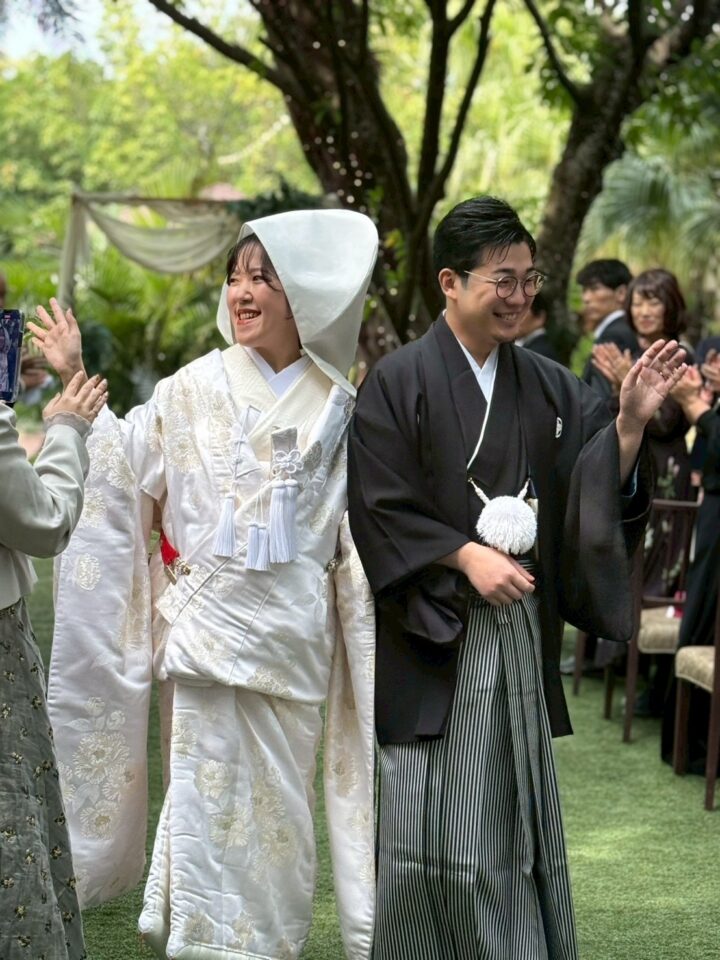 自分たちの衣装も定まり、私は紋付袴とブラックタキシード、妻の衣装は白無垢、披露宴入場でウエディングドレス、お色直しにてカラードレスの三着を選んでくれました。